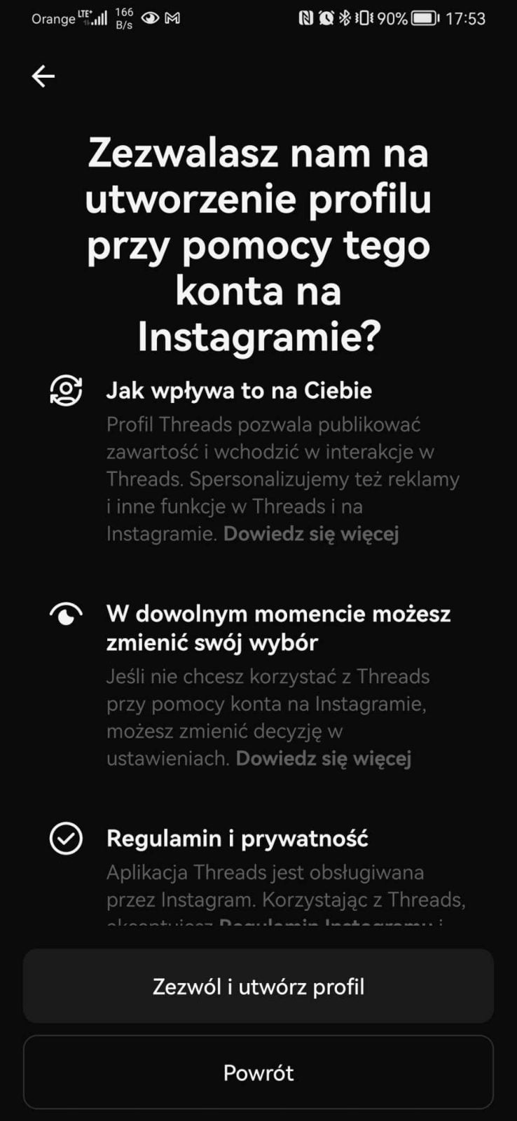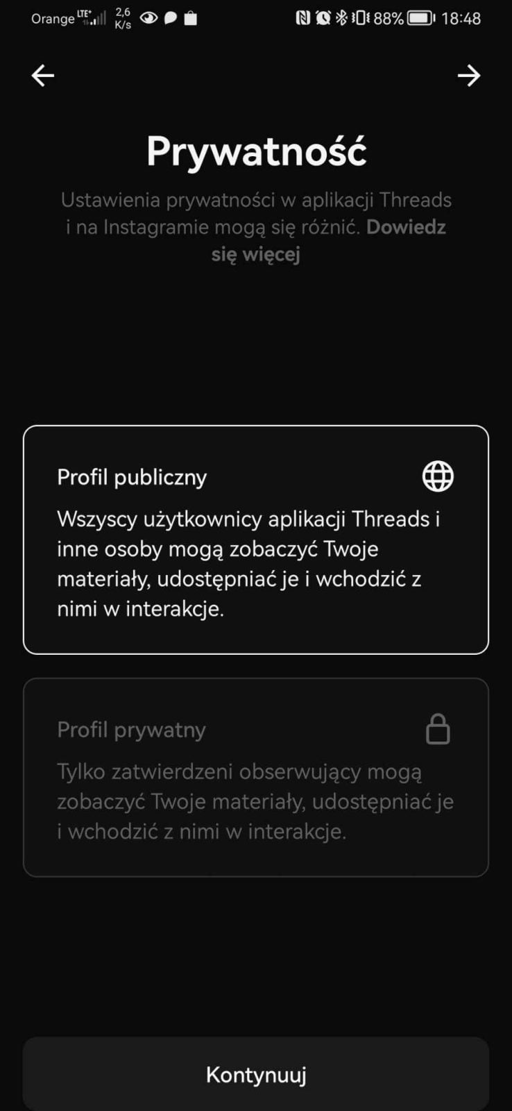 Podczas logowania przy użyciu Instagrama mamy bardzo ułatwione zadanie. Nie dość, że Threads mogą zaimportować nasze dane z drugiej platformy, to jeszcze od razu dają możliwość obserwowania tych samych profili, które obserwujemy na Instagramie. Można też ustawić swój profil jako publiczny lub prywatny. Tutaj pewna uwaga – jeśli korzystacie z Wątków bez logowania, nie zobaczycie postów z profilów prywatnych. Nie będziecie też mogli podejmować żadnych interakcji czy pisać postów.