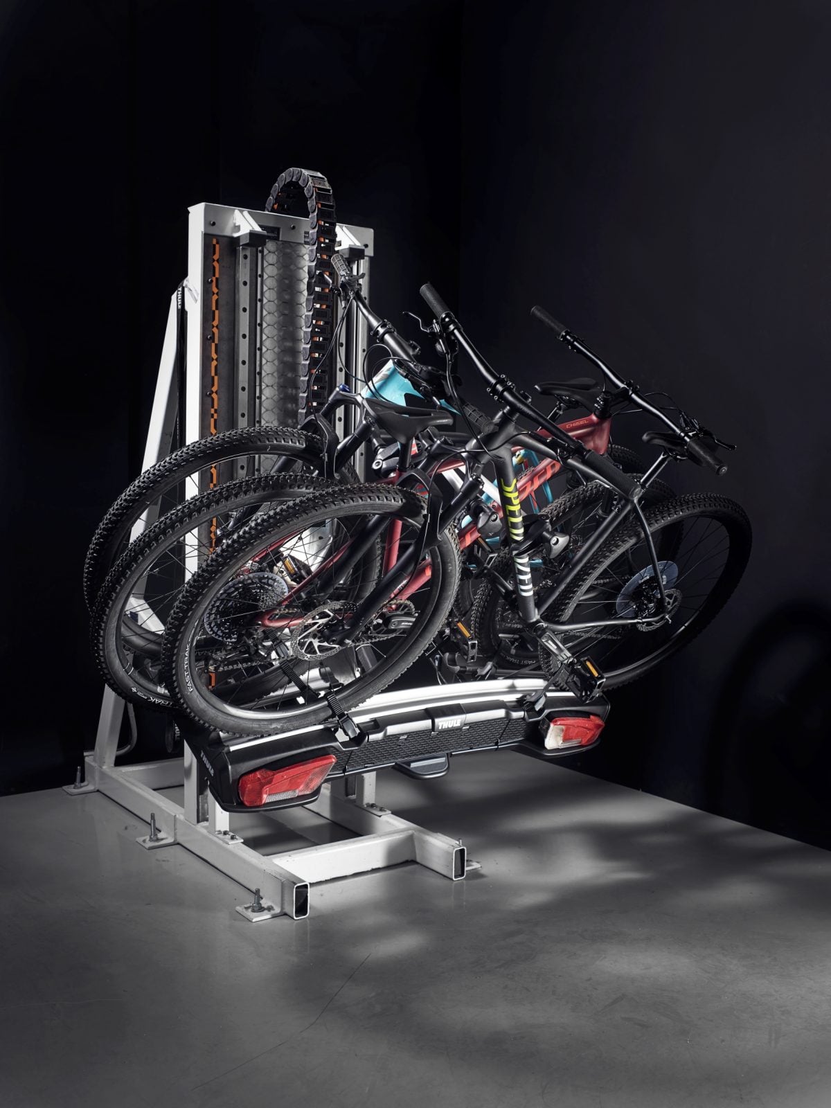 Do bagażnika możemy też dokupić szereg akcesoriów, które dodatkowo ułatwią załadunek roweru czy jego późniejszą obsługę. Bardzo ciekawym dodatkiem jest Thule Epos Foldable Loading Ramp, czyli rampa ułatwiająca wprowadzenie ciężkiego (np. elektrycznego) roweru na bagażnik. Jeśli mamy rower typu fat-bike – nic strasznego, wystarczy dokupić pasy XXL do przymocowania ponadgabarytowych opon do teleskopowych ramion. Dokupić możemy też wysokiej klasy zabezpieczenie przeciwkradzieżowe, przydatne w czasie podróży, jeśli chcemy zostawić rowery bez nadzoru. Do tego możemy dołożyć Thule Bike Repair Holder, czyli ramię ułatwiające serwisowanie roweru na trasie.