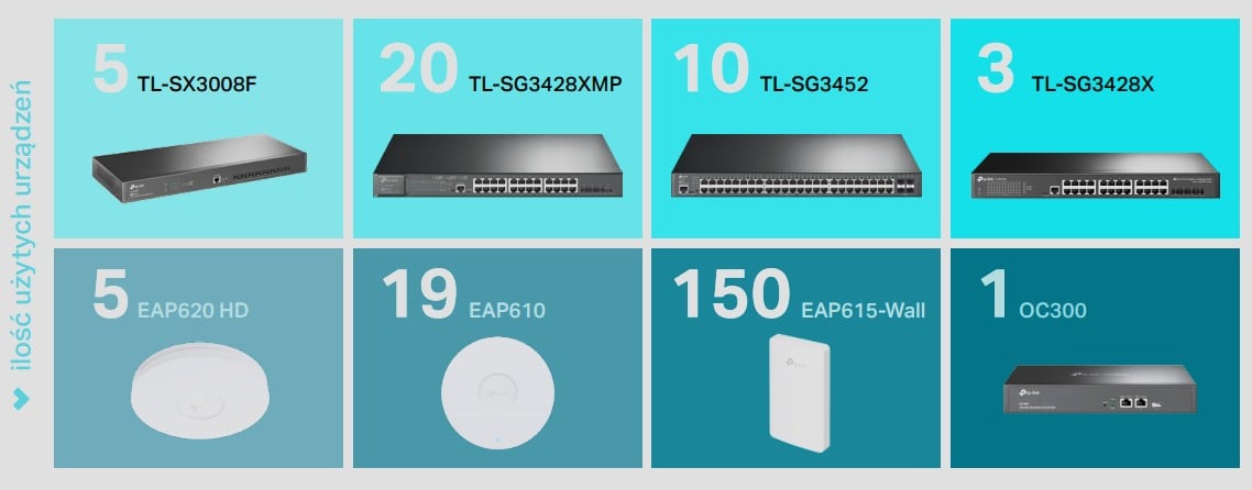 W głównym punkcie dystrybucyjnym znalazły się dwa 8-portowe przełączniki (tzw. switche) SFP+ 10G TL-SX3008F. Połączenia światłowodowe oraz wkładki 10G TL-SM5110-LR zapewniające zwiększenie odległości transferowych w oparciu o łącze Ethernet 10G, pozwoliły uzyskać szybkie połączenie między wszystkimi 11 lokalnymi punktami dystrybucyjnymi. Przy okazji, przyjrzyjmy im się nieco bliżej, bo dzieje się tam całkiem sporo. W trzech większych punktach odpowiadających dodatkowo za kamery IP i dostęp do sieci przewodowych, zastosowano dwa rodzaje urządzeń – oprócz przełączników PoE (Power over Ethernet) TL-SG3428XMP oraz dostępowych TL-SG3452 wykorzystano przełącznik agregujący TL-SX3008F z 8 slotami SFP+ o prędkości 10 Gb/s. Dzięki niemu dostępne są szybkie połączenia w sieci lokalnej bez tzw. “wąskich gardeł”.