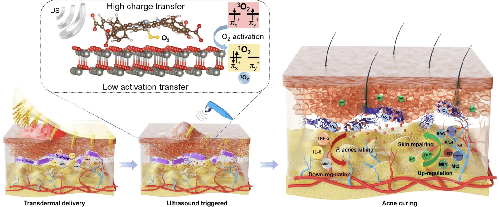 W przypadku plastra opracowanego przez uczonych z Hongkongu, nanocząstki oparte na cynku stymulowane ultradźwiękami są w stanie wytworzyć znaczną ilość reaktywnych form tlenu (ROS), które błyskawicznie utleniają komórki bakterii. Wyniki pokazują, że zabijanie bakterii P. acnes za pośrednictwem ROS może osiągnąć 99,73 proc. po 15 minutach stymulacji ultradźwiękami. Jeżeli chodzi o poziomy markerów stanu zapalnego, m.in. czynnika martwicy nowotworu-a (TNF-α), interleukin (IL) i metaloproteinaz macierzy (MMP) są znacznie zmniejszone. Uwolnione jony cynku mogą podnieść poziom genów związanych z replikacją DNA, zwiększając w ten sposób więcej fibroblastów w kierunku lepszej naprawy skóry.