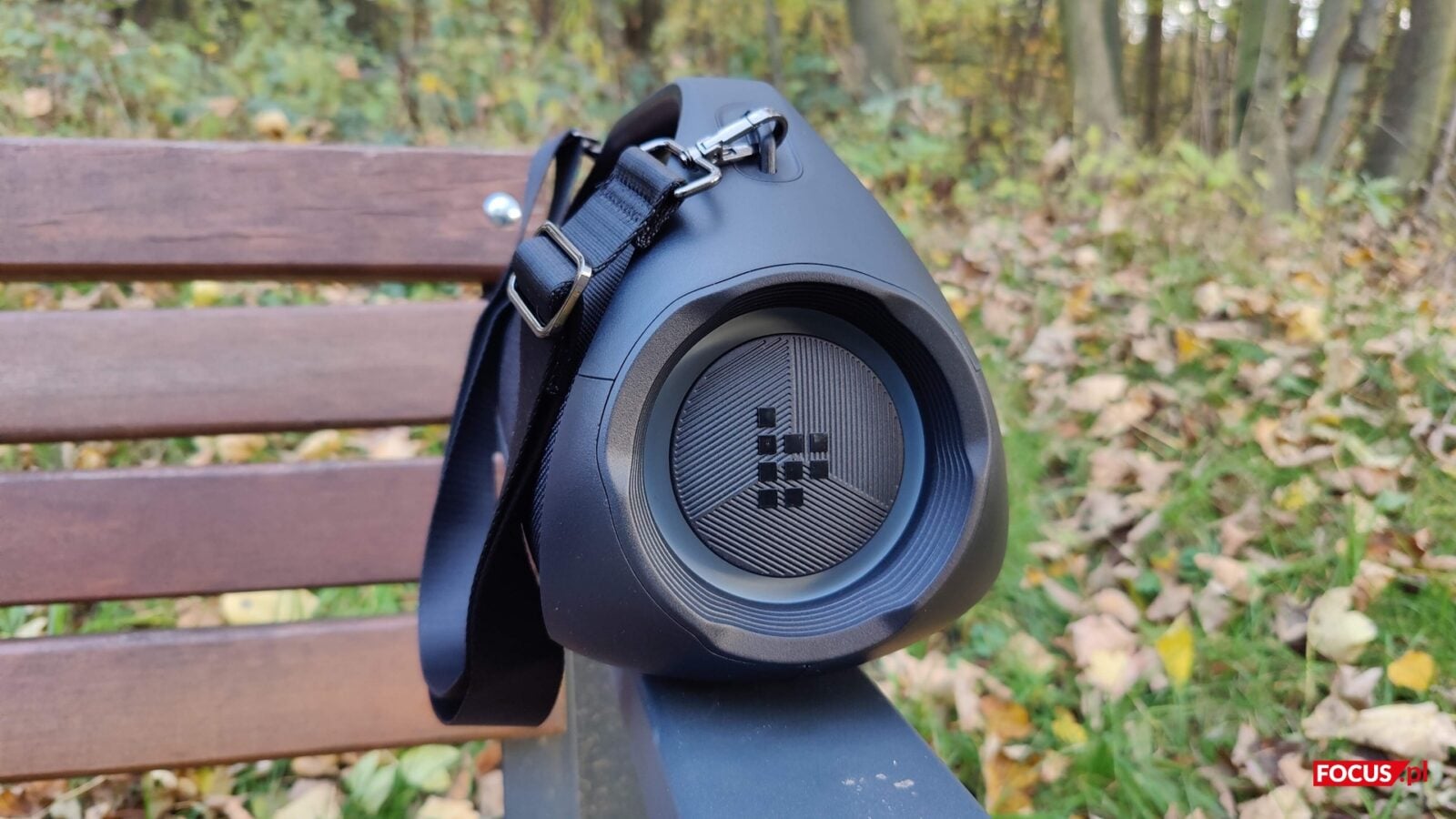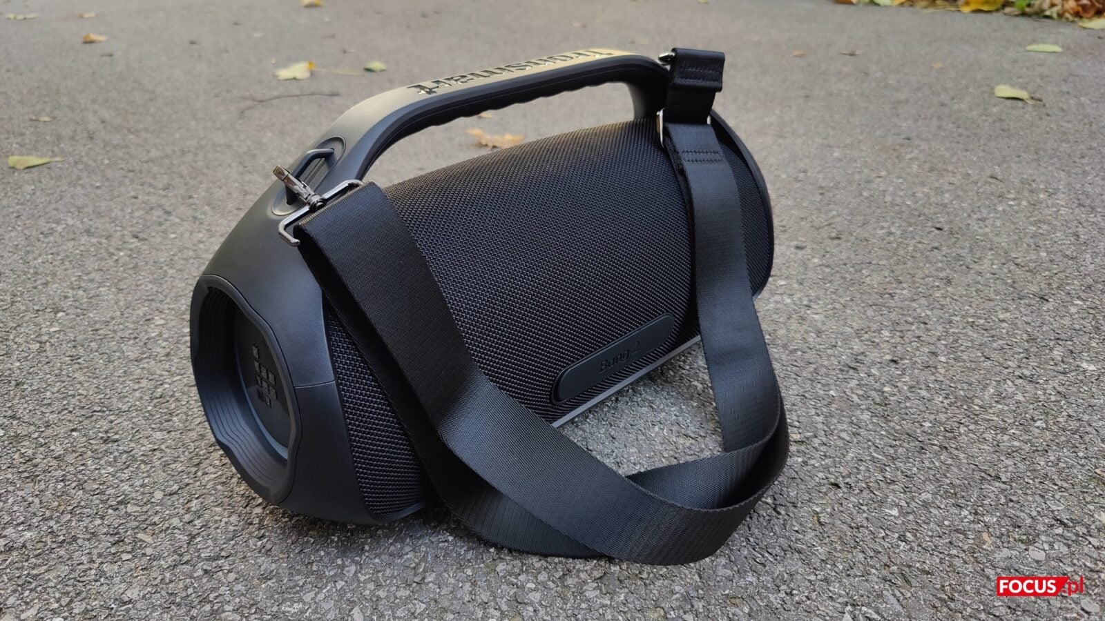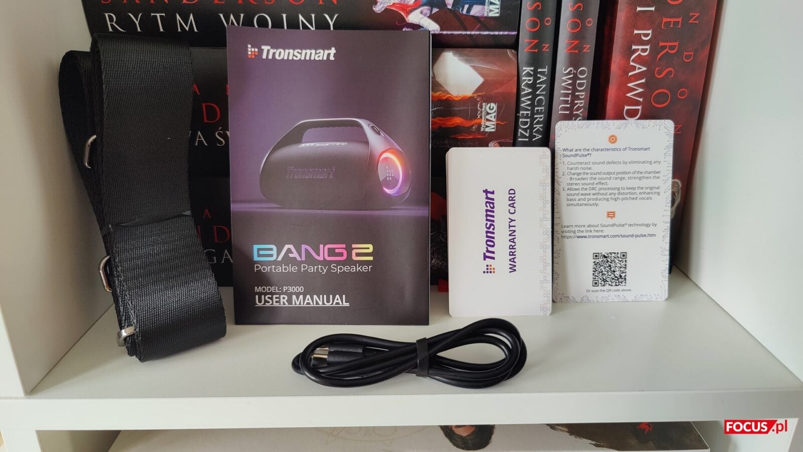 Zestaw jest prosty. Oprócz głośnika dostajemy przewód USB-C do ładowania, kartę gwarancyjną, instrukcję obsługi oraz regulowany pas materiałowy, który wpina się w dwa zaczepy obudowy. Pasek nie jest dodatkiem na pokaz, bo realnie ułatwia noszenie i pozwala zawiesić Bang 2 na ramieniu lub podwiesić go np. na gałęzi, jeśli sytuacja tego wymaga. Instrukcja jest skrótowa, ale w praktyce zbędna – parowanie i start zajmują chwilę.