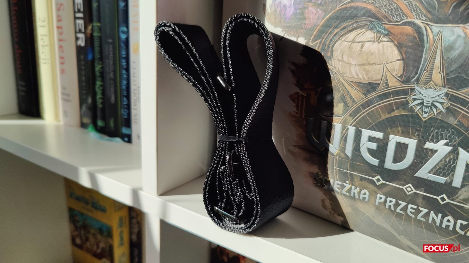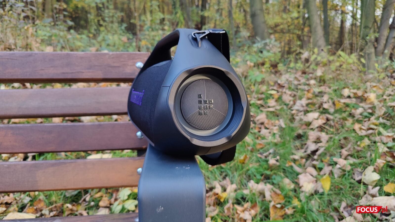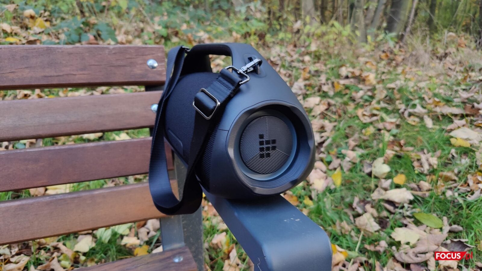 Zestaw jest prosty. Oprócz głośnika dostajemy przewód USB-C do ładowania, kartę gwarancyjną, instrukcję obsługi oraz regulowany pas materiałowy, który wpina się w dwa zaczepy obudowy. Pasek nie jest dodatkiem na pokaz, bo realnie ułatwia noszenie i pozwala zawiesić Bang 2 na ramieniu lub podwiesić go np. na gałęzi, jeśli sytuacja tego wymaga. Instrukcja jest skrótowa, ale w praktyce zbędna – parowanie i start zajmują chwilę.