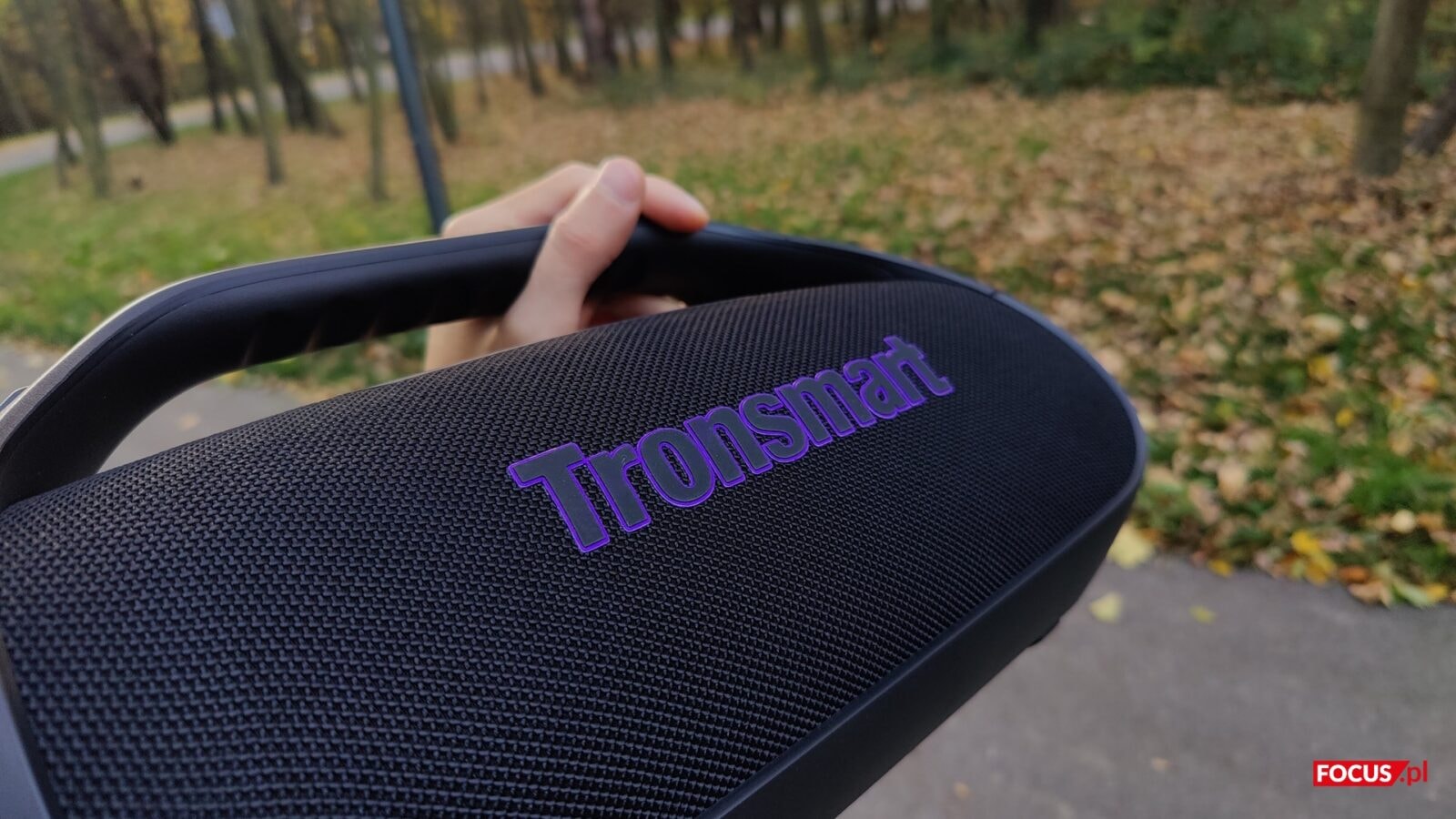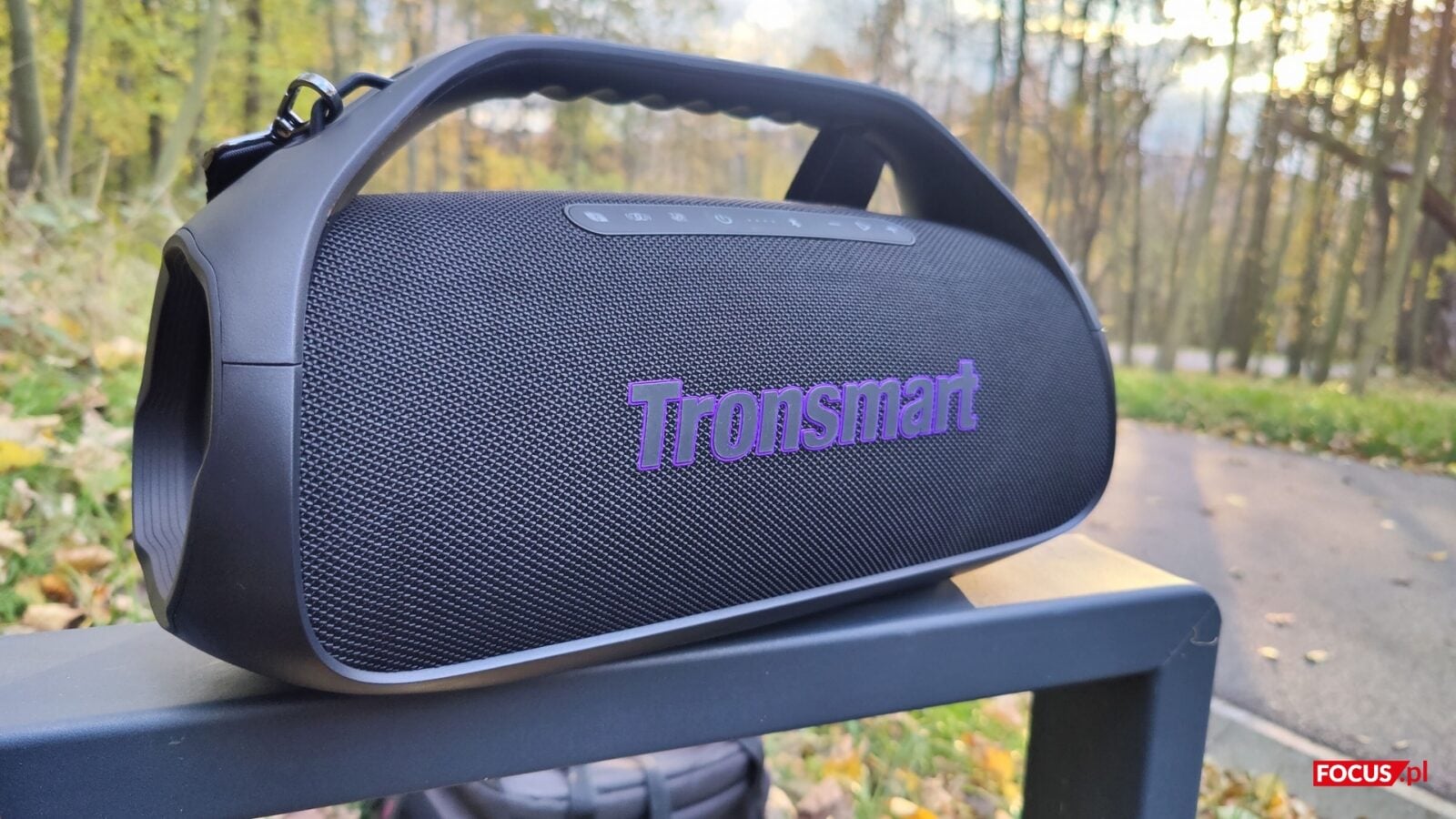 Tronsmart Bang 2 jest duży jak na klasę stricte mobilnych głośników. Wymiary 389 × 208 × 158 mm i masa około 2,63 kg lokują go bliżej klasycznego boomboksa niż kompaktowej tuby, więc mobilność rozumiemy tu jako przenoszenie z auta na miejsce imprezy, a nie wsadzanie go do plecaka przy podróży w góry. Zintegrowany uchwyt spisuje się tak, jak powinien – pewnie i bez luzów. Boki zdobią pierścienie podświetlenia okalające pasywne radiatory, a spód zabezpiecza szeroka, gruba guma, która trzyma głośnik stabilnie na blacie i nie przenosi niepotrzebnych drgań na meble.
