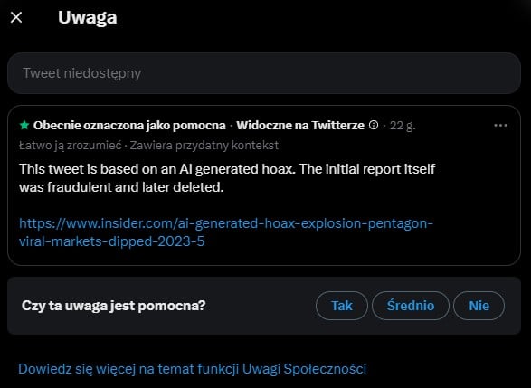 Problem w tym, że żadnego ataku na Pentagon nie było, o czym bardzo szybko poinformowały odpowiednie służby, a obraz, jaki widzicie powyżej, został najprawdopodobniej stworzony przez sztuczną inteligencję. Tweet został już usunięty, a dokładniej – zastąpiony wpisem z odpowiednim ostrzeżeniem, informującym, że „Ten tweet jest oparty na mistyfikacji wygenerowanej przez sztuczną inteligencję. Początkowy raport sam w sobie był fałszywy, a później usunięty”.
