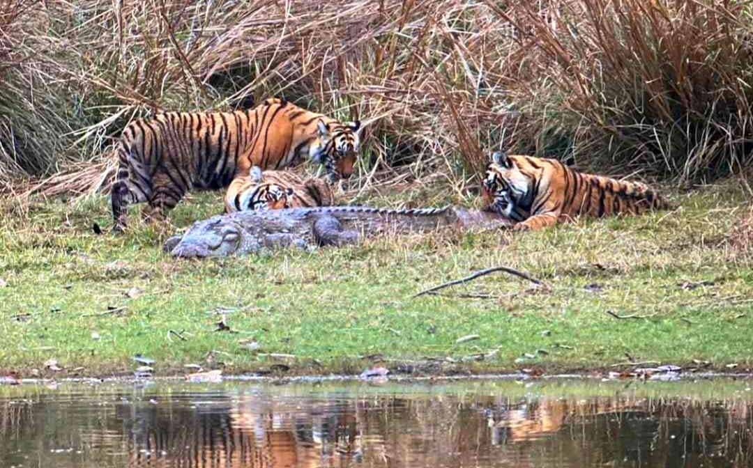 W sercu Parku Narodowego Ranthambore w Radżastanie surowe piękno dzikiej przyrody ukazało swój cały majestat. W poniedziałek 15 kwietnia miała miejsce urzekająca scena, podczas której słynna tygrysica Riddhi i jej trzy młode ucztowały na zwłokach krokodyla, który chwilę wcześniej został zabity.