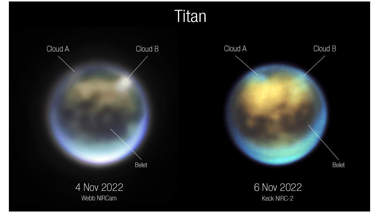 Porównując różne obrazy uchwycone przez NIRCam, naukowcy potwierdzili, że jasna plama widoczna na północnej półkuli Tytana była w rzeczywistości dużą chmurą. Niedługo potem zauważyli drugą chmurę. Ich wykrycie jest ekscytujące, ponieważ potwierdza długoletnie przewidywania modeli komputerowych dotyczących klimatu Tytana, według których chmury będą się łatwo tworzyć na półkuli północnej podczas późnego lata, gdy powierzchnia jest ogrzewana przez Słońce.