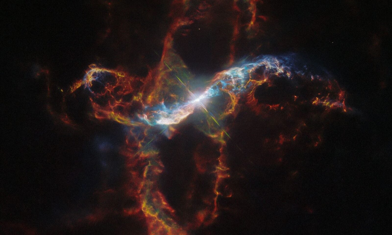 Obserwacje prowadzone na przestrzeni lat pozwoliły naukowcom odtworzyć historię ewolucji tego układu. W centrum kadru znajdziemy tutaj czerwonego olbrzyma, który jest gwiazdą zmienną typu Mira. Takie gwiazdy zbliżają się do końca cyklu swojego życia i charakteryzują się pulsacjami, w efekcie których świecą one nawet 1000 razy jaśniej od Słońca. Podczas tej fazy zewnętrzne warstwy takich gwiazd rozszerzają się i są stopniowo odrzucane w przestrzeń międzygwiezdną, tworząc dramatyczny spektakl niebiański.