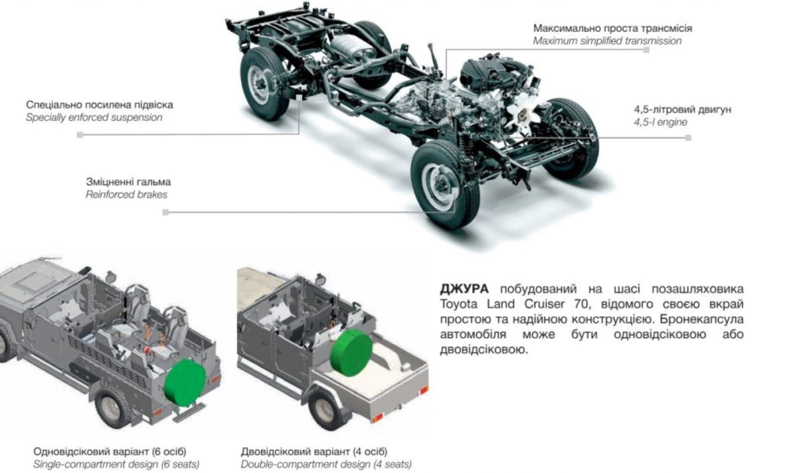 Ukraiński producent pojazdów opancerzonych, NVO „Praktyka”, po raz pierwszy zaprezentował właśnie swój lekki pojazd opancerzony o nazwie Dżura (Djura). Jest to pojazd taktyczny typu SUV, który został zbudowany na bazie cywilnego terenowego samochodu Toyota Land Cruiser 70. Nie można więc oczekiwać po nim fenomenalnych możliwości bojowych i rzeczywiście Dżura jest przeznaczona do wykonywania zadań o niskim ryzyku. Efekt? Może być używana głównie przez jednostki policji oraz siły specjalne do bardzo specyficznych akcji, w których nie oczekuje się znacznego oporu ze strony wrogów.