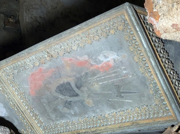 Gdy pracownicy budowlani zajmowali się skuwaniem tynku z jednej ze ścian, zorientowali się, iż za nią jest zlokalizowane ukryte pomieszczenie. Bliższa inspekcja doprowadziła zgromadzonych do wniosku, że chodzi o kryptę, w której ktoś umieścił cynowy sarkofag zdobiony polichromią.