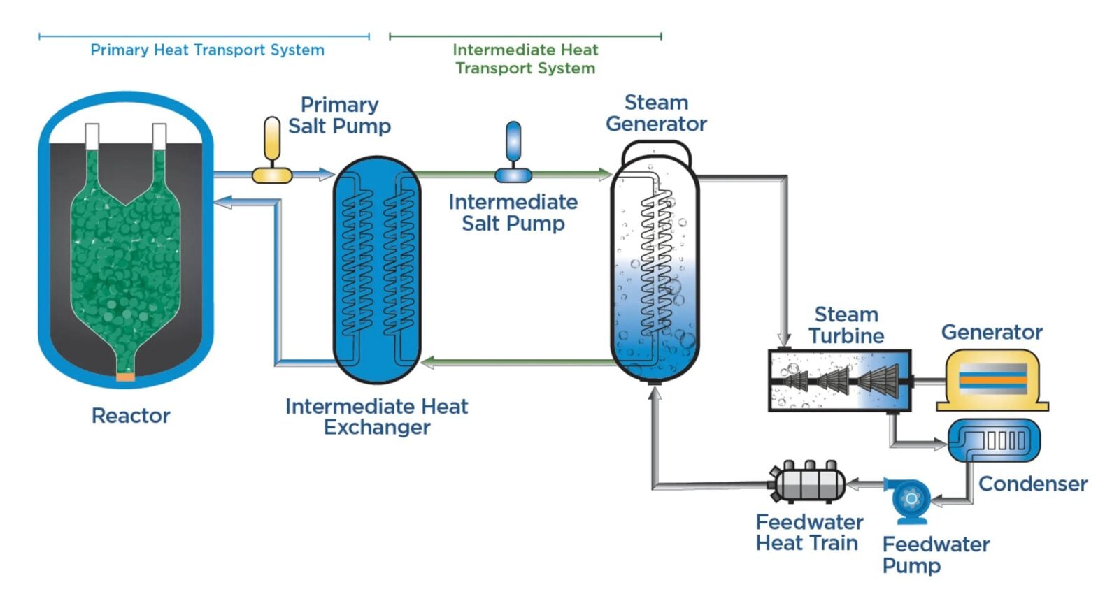 Hermes wyróżnia się też wykorzystywaniem nie helu, a stopionych soli fluorkowych do chłodzenia. Sole te utrzymują rdzeń reaktora w temperaturze 585°C, przenosząc ciepło do wtórnego obiegu solnego połączonego z generatorem pary napędzającym turbinę, co zapewnia, że reaktor działa przy normalnym ciśnieniu na poziomie morza, eliminując potrzebę specjalnych struktur obudowy lub naczyń ciśnieniowych.