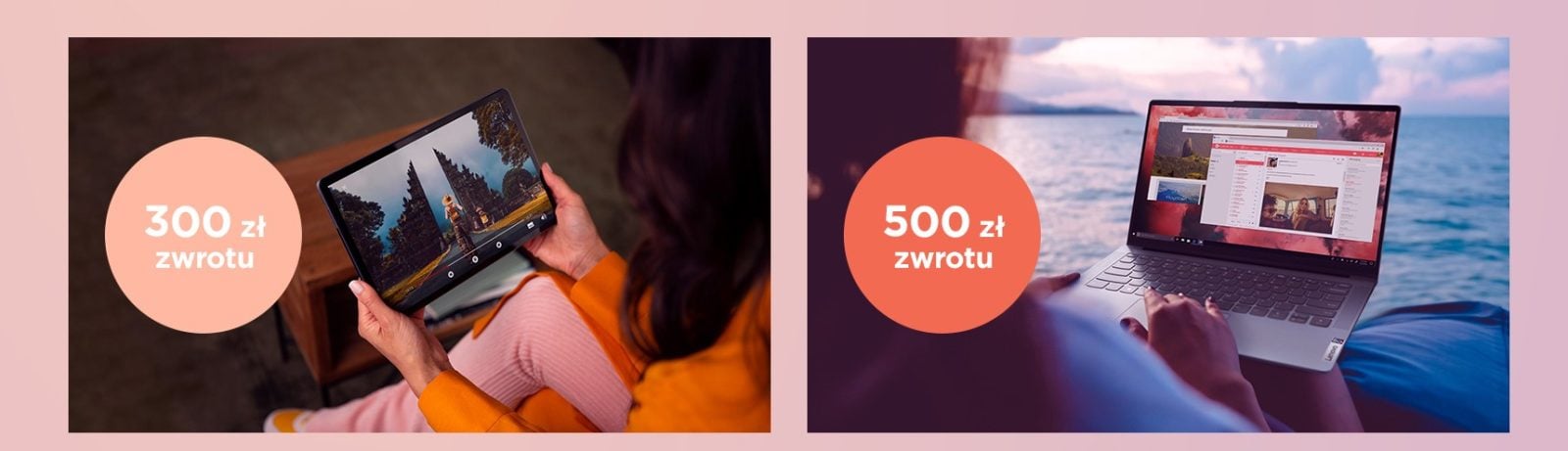 - 300 zł zwrotu przy zakupie dowolnego urządzenia Lenovo z serii Yoga i IdeaPad oraz tabletów Lenovo Tab P11 2. gen, Tab P11 Pro 2. gen i Tab P12 Pro. Są to więc propozycje dla osób szukających smukłego laptopa do pracy, lekkie ultrabooka idealnego do zabrania ze sobą na uczelnię albo wydajnego tabletu graficznego ze świetnym dźwiękiem i nawet 10-godzinnym czasem pracy na jednym ładowaniu.