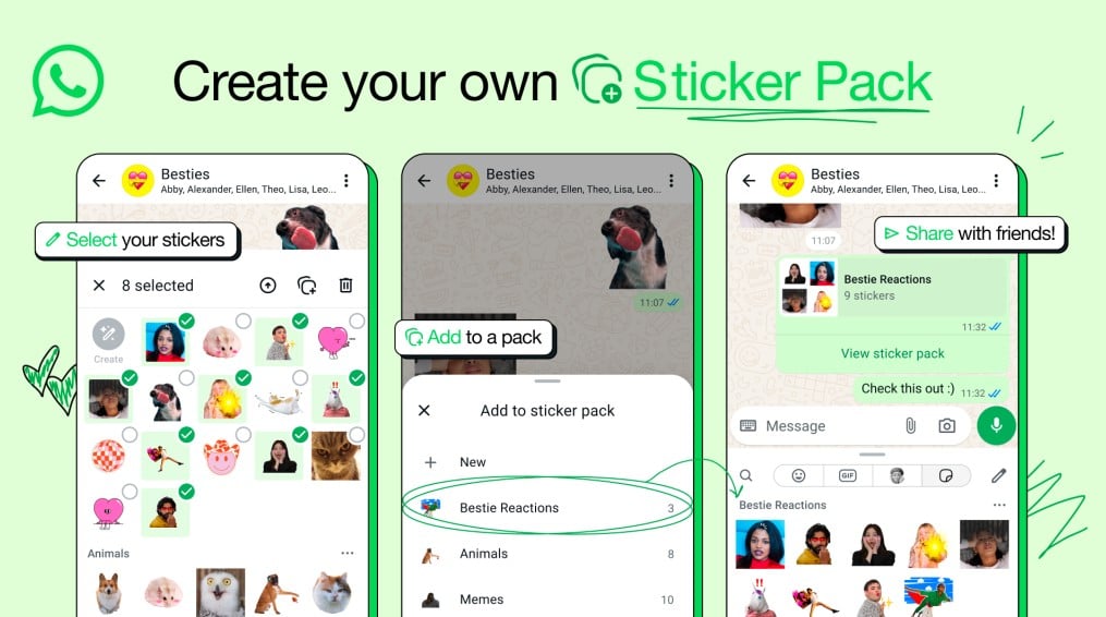 Niezależnie od tego, czy to pakiet naklejek z Twoim psem, czy zabawne selfie Twoich najbliższych przyjaciół, teraz możesz uczynić swoje czaty bardziej zabawnymi i osobistymi dzięki pakietom naklejek, które są unikalne dla Ciebie. Wcześniej w tym roku wprowadziliśmy udostępnianie pakietów naklejek, więc teraz możesz tworzyć i udostępniać swoje własne pakiety naklejek znajomym i rodzinie bezpośrednio w czacie – powiedział rzecznik WhatsAppa w rozmowie z 9to5Mac.