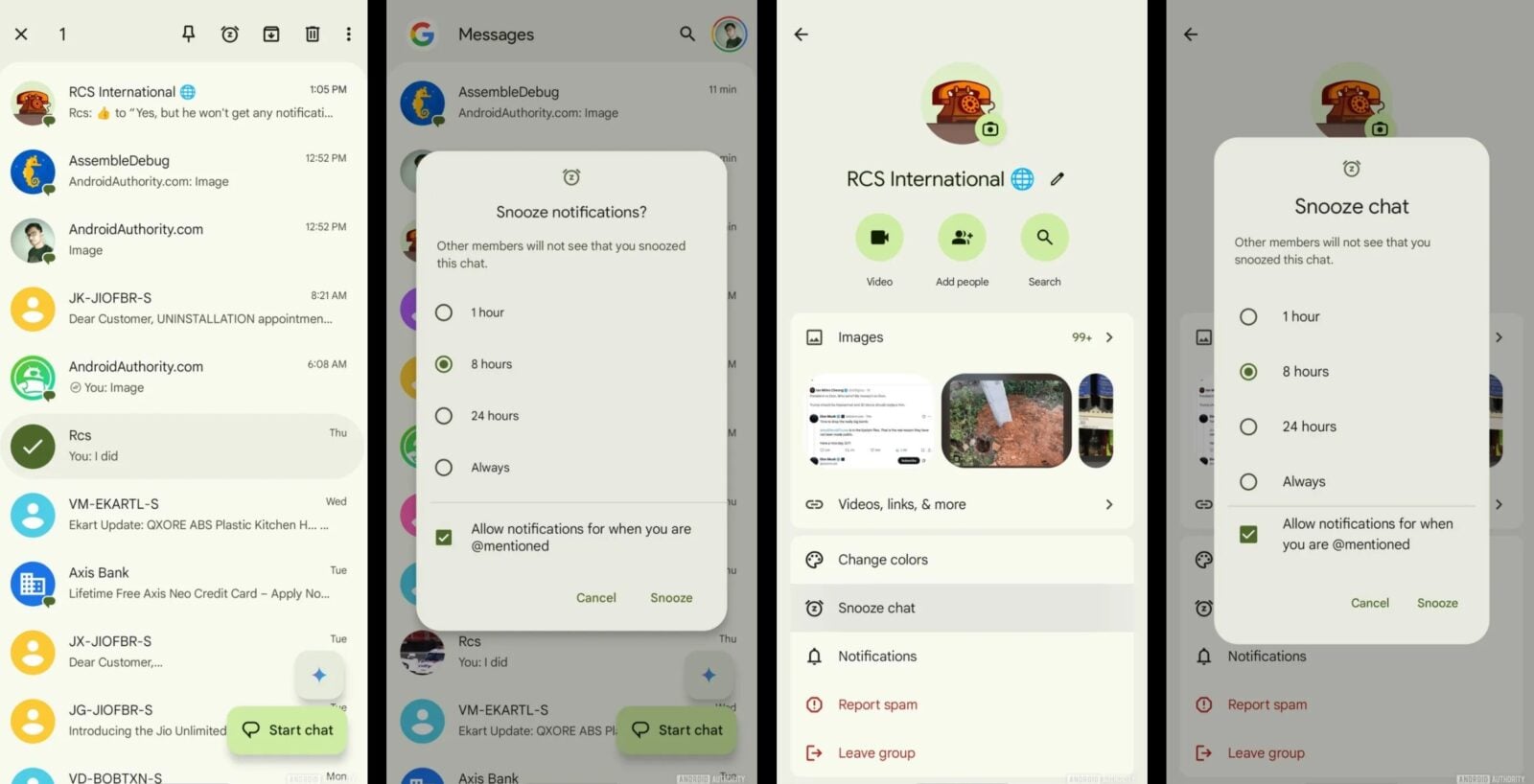 Jeśli zaś chodzi o beta-testerów Wiadomości Google, zyskują oni przydatną funkcję – możliwość wyciszenia powiadomień dla konkretnych czatów na określony czas. Po długim naciśnięciu wybranego czatu na górnym pasku narzędzi pojawi się nowy przycisk “drzemki”. Dotknięcie go wyświetli wyskakujące okienko, w którym będzie można wybrać czas wyciszenia: jedną godzinę, osiem godzin, 24 godziny lub na zawsze. Nowa opcja “drzemki” jest również dostępna w profilach użytkowników. Działa zarówno dla czatów indywidualnych, jak i grupowych. W przypadku czatów grupowych, użytkownicy mogą wybrać, czy chcą otrzymywać powiadomienia, gdy zostaną oznaczeni (wspomniani) w wyciszonym czacie.