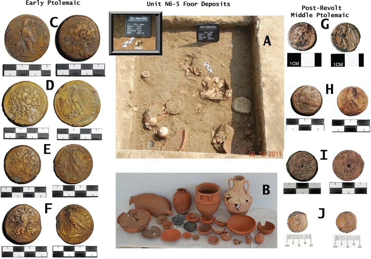Jeśli chodzi o Tell Timai, to miejsce to jest zlokalizowane około 100 kilometrów od Kairu i swego czasu było grecko-rzymskim miastem znanym jako Thmouis. Wszystko wskazuje na to, że na miejscu musiało dojść do poważnego konfliktu, o czym świadczą pozostałości spalonych budynków, broni i kamieni wystrzeliwanych przez maszyny oblężnicze. Opierając się na monetach znalezionych pod deskami podłogowymi, fragmentach ceramiki i przedmiotów o greckim pochodzeniu, archeolodzy uznali, że artefakty te musiały wywodzić się z wczesnej epoki ptolemejskiej.