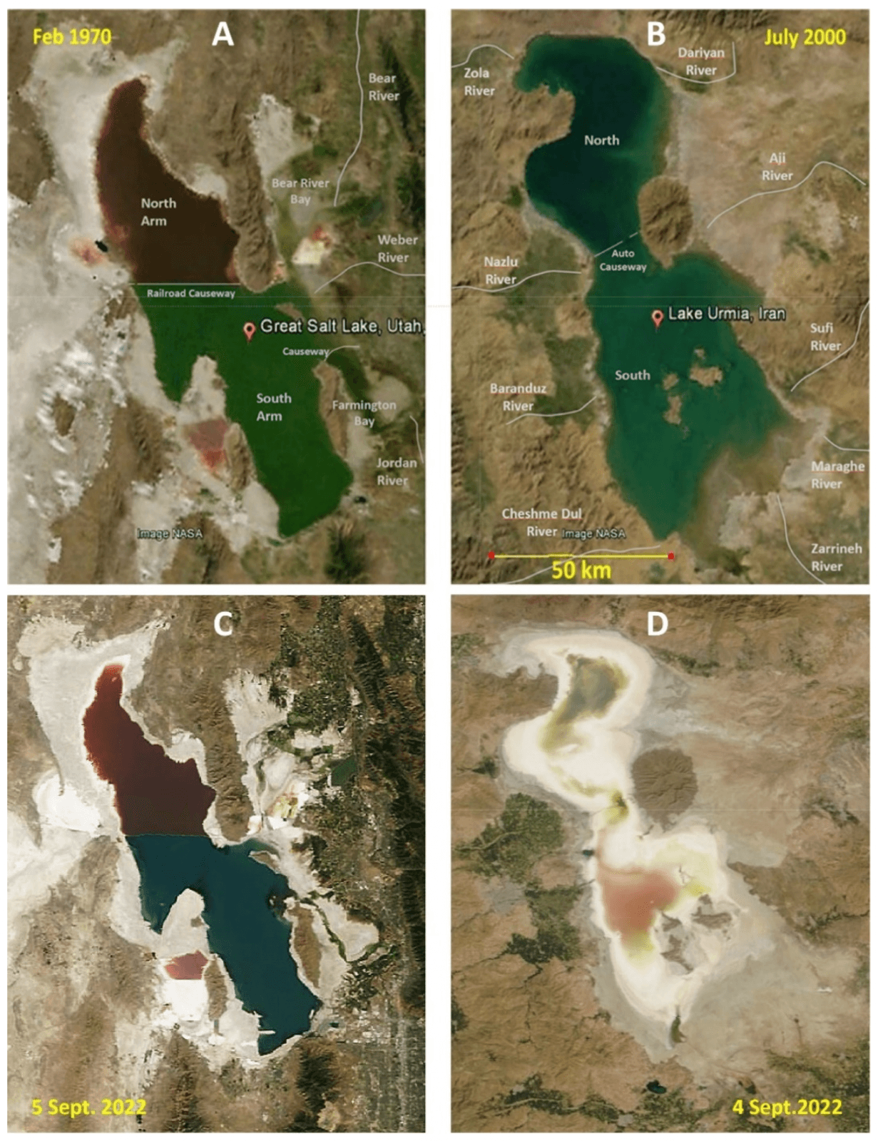 Jak się okazuje, obydwa jeziora miały do niedawna podobną powierzchnię, podobny poziom zasolenia oraz obydwa cierpią wskutek nadmiernego poboru wody z rzek zasilających zbiorniki. Zarówno okolice amerykańskiego zbiornika, jak i irańskiego stają się coraz gęściej zaludniona, a presja na środowisko jest silniejsza. Na potrzeby rolnictwa oraz wodociągów pobiera się się coraz więcej wody. Ma to ogromny wpływ na stan jezior.