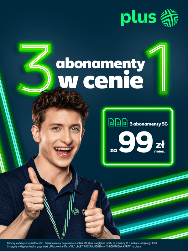 Teraz operator oferuje Mistrzowską Ofertę 3 w 1 – jak sama nazwa wskazuje, dostajemy tutaj trzy numery, a miesięczny koszt takiej opcji wynosi 99 złotych na 24 miesiące. To doskonała okazja, by zapewnić kolejnemu członkowi rodziny nielimitowane rozmowy, SMS-y i MMS-y. Takie właśnie udogodnienia dostępne będą na każdym z numerów. Dodatkowo będziemy mieli aż 750 GB danych do wspólnego wykorzystania na wszystkich trzech numerach. Promocja obowiązuje od 9 kwietnia i skierowana jest do nowych klientów, osób przechodzących do Plusa oraz dotychczasowych użytkowników oferty Plus na Kartę czy Mix.