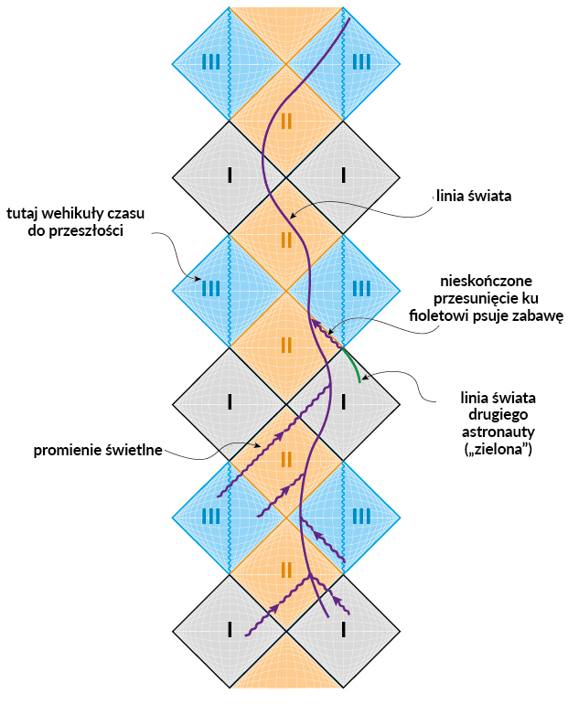 Po wejściu do drugiej czarnej dziury cała historia się powtarza, dopóki nie zanurzy się w trzeciej czarnej dziurze. Wynurzając się w obszarze III u góry rysunku, jest teraz gotowy stawić czoła osobliwości. Nurkuje przez pierścień do innego nowego wszechświata w nieskończonej wieży wszechświatów. Jednak ten wszechświat bardzo różni się od innych. W tym obszarze czasoprzestrzeni grawitacja odpycha, a nie przyciąga. Jest to wszechświat antygrawitacyjny. Astronauta nadal będzie mógł obrócić się i podążyć z powrotem przez pierścienistą osobliwość. Ale możliwe jest również, iż tak wszystko zaplanuje, że wyłoni się z niego, zanim do niego wejdzie. Jest to możliwe, ponieważ istnieją ścieżki, którymi nasz astronauta może podążać w obszarze III, tworzące pętlę i wracające do tego samego punktu. Nie jest możliwe narysowanie takich ścieżek na diagramie Penrose’a, ponieważ wymagają one wykonania pętli w jednym z wymiarów, których nie narysowaliśmy. Ścieżki te nazywamy „zamkniętymi krzywymi czasowymi”. Wyobraźmy sobie ścieżkę w czasoprzestrzeni, która zaczyna się dzień przed naszymi urodzeniem, a kilka lat później (według naszego zegarka) wraca na dzień przed naszymi narodzinami. To nic innego jak podróż w czasie. Takie ścieżki są możliwe w geometrii czasoprzestrzeni w obszarze III. Oznacza to, że czarna dziura Kerra jest wehikułem czasu.