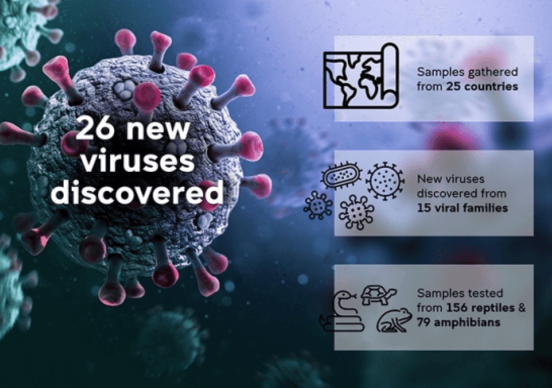 Wiemy wiele o wirusach, które zarażają nas i zwierzęta gospodarskie, jednak niewiele osób badało wirusy, które infekują płazy i gady, mimo że na świecie istnieje ponad 18 000 gatunków. Przejrzeliśmy ponad 200 zestawów danych RNA płazów i gadów w poszukiwaniu dowodów na istnienie nowych wirusów, które mogłyby prowadzić do chorób. Znaleźliśmy 26 nowych wirusów z różnych rodzin i teraz lepiej rozumiemy, jakie wirusy mogą infekować te zwierzęta.