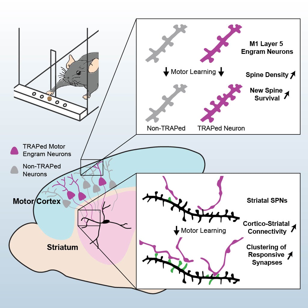 Naukowcy wykorzystali mikroskopię dwufotonową do obserwacji żywych obwodów neuronalnych i zaobserwowali, że tzw. neurony engramowe przeprogramowują się w miarę jak myszy się uczą. Nowe połączenia tworzyły się w odległej od kory motorycznej części mózgu – prążkowiu grzbietowo-bocznemu, miejscu, w którym neurony engramu mogą sprawować kontrolę nad ruchami zwierzęcia. Po raz pierwszy w historii zaobserwowano tworzenie nowych ścieżek synaptycznych w tej samej populacji neuronów.