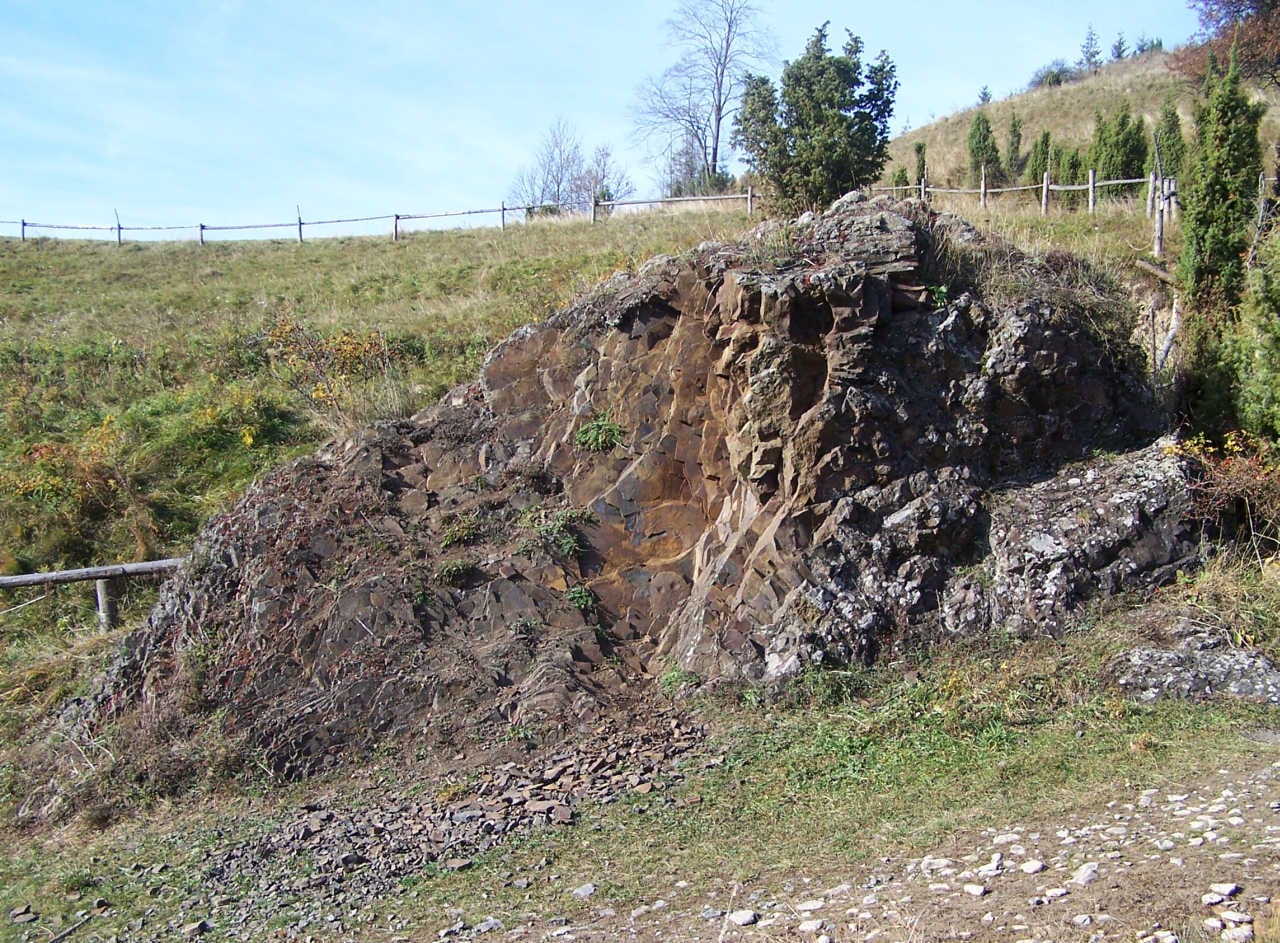 Niewielka bazaltowa skała znajdująca się w Małych Pieninach na skraju dawnej wsi Biała Woda tak naprawdę nie powinna znajdować się w tym zestawieniu, ale ze względu na jej zagadkowość postanowiliśmy ją jednak umieścić. Wędrując szlakiem przez rezerwat Biała Woda, w jego niedalekim sąsiedztwie możemy natrafić na nietypowe miejsce – otóż w otoczeniu skał wapiennych znajduje się bazaltowa skała. Przez wiele lat sądzono, że jest to pozostałość po wręcz miniaturowym wulkanie (albo raczej niewielkiej intruzji bez wyraźnego kształtu stożka) sprzed tylu lat, co niedalekie Jarmuta, Bryjarska czy Wdżar. Odsłonięcie nawet wykazuje cechy ciosu kolumnowego, zatem „jakaś lawa musiała płynąć i zastygnąć w tym miejscu” – możemy lakonicznie pomyśleć. Dokładne datowania przyniosły spore zaskoczenie, a dla niektórych pewno i rozczarowanie. Bazaltowa skałka nie jest śladem żadnej mioceńskiej erupcji, a tylko zwykłym porwakiem skalnym, który jako pozostałość z nieistniejącego już starszego wulkanu spłynął podczas jednego z wielu podmorskich megaosuwisk razem z innymi osadami w trakcie formowania się fliszu karpackiego. Wiek bazaltu okazał się jurajski, a więc jest on o co najmniej 120 mln lat starszy niż sądzono.