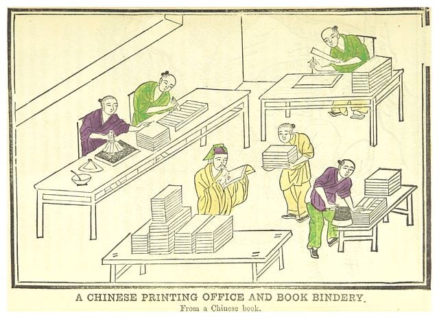 Wynalazek druku przypisać należy buddyjskim mnichom, którzy by propagować swą wiarę wśród rzesz ludności Państwa Środka, potrzebowali ogromnych liczby kopii świętych pism. Pierwotnie uzyskiwano je, robiąc tuszowe odbitki tekstów wyrytych w kamieniu, była to jednak metoda niewygodna. W VIII wieku sprytni bonzowie zainspirowani tą praktyką sporządzili pierwsze drewniane matryce drukarskie, które posłużyły im do robienia odbitek sutr. Bardzo szybko wynalazek ów znalazł zastosowanie świeckie, a w IX wieku w Chinach istniał już rozwinięty rynek wydawniczy, na którym największe bestsellery osiągały nakłady nawet kilkuset tysięcy egzemplarzy!