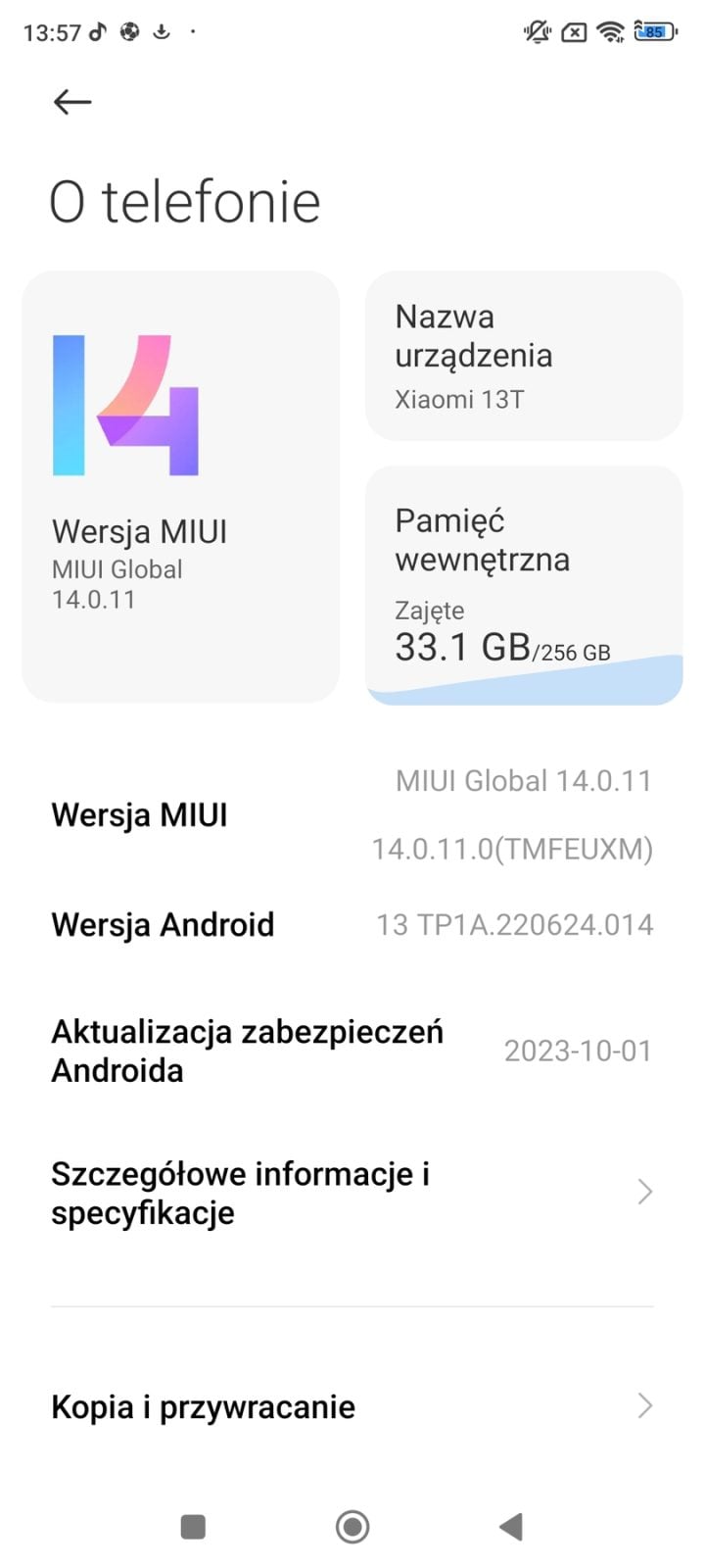 - System: Android 13 z MIUI Global 14