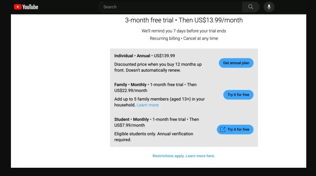 W przypadku planu Indywidualnego mowa o podwyżce wynoszącej 2 dolary, co oznacza, że w Stanach Zjednoczonych miesięczna opłata to teraz 13,99 dolara. Roczna opłata zdrożała o 20 dolarów (do 139,99 dolara) oraz plan studencki, choć tutaj różnica to tylko jeden dolar. Co ciekawe, abonament rodzinny pozostał bez zmian, co dla wielu osób będzie zapewne bardzo dobrą wiadomością – chyba jedyną. Okazało się bowiem, że YouTube nie oszczędził także lojalnych użytkowników, którzy niższą stawkę płacą od 2018 roku. Ich również obejmie nowy cennik, ale w ramach łaski serwis zapewnił ich, że wyższe opłaty zaczną ponosić dopiero od grudnia.