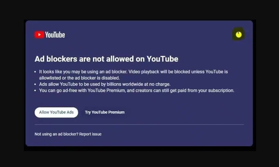 Jak możecie zauważyć na powyższym zrzucie ekranu, w prawym górnym rogu widać licznik od 30 do 60 sekund. Ma on odliczać czas do włączenia następnej reklamy. Na dole są też dwa przyciski – jeden na włączenie reklam na YouTubie, a drugi przekierowujący do subskrypcji. Jest też opcja zgłoszenia problemu w sytuacji, gdy nie mamy włączonego blokera, a i tak wyświetla nam się to powiadomienie.