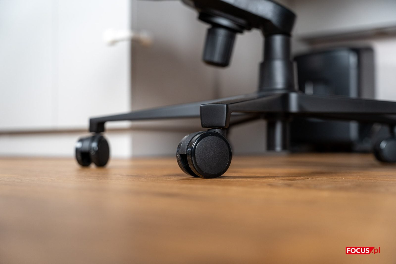 Cała konstrukcja jest wzorowo wykonana. Mamy tu aluminium, a wypełnienie tworzy pianka z odlewu tłoczona na zimno. Kółka, zgodnie z zapewnieniami producenta, poruszają się bezgłośnie i nie rysują podłogi. W zasadzie jedynymi dźwiękami jest sprężyna w oparciu, która czasem bardzo delikatnie zaskrzypi przy dynamicznej zmianie pozycji. Materiał pokrywający fotel jest wysokiej jakości, ale jeśli podobnie jak ja macie długowłosego kota z jasną sierścią to… nie polecam. Będziecie go odkurzać co dwa dni.