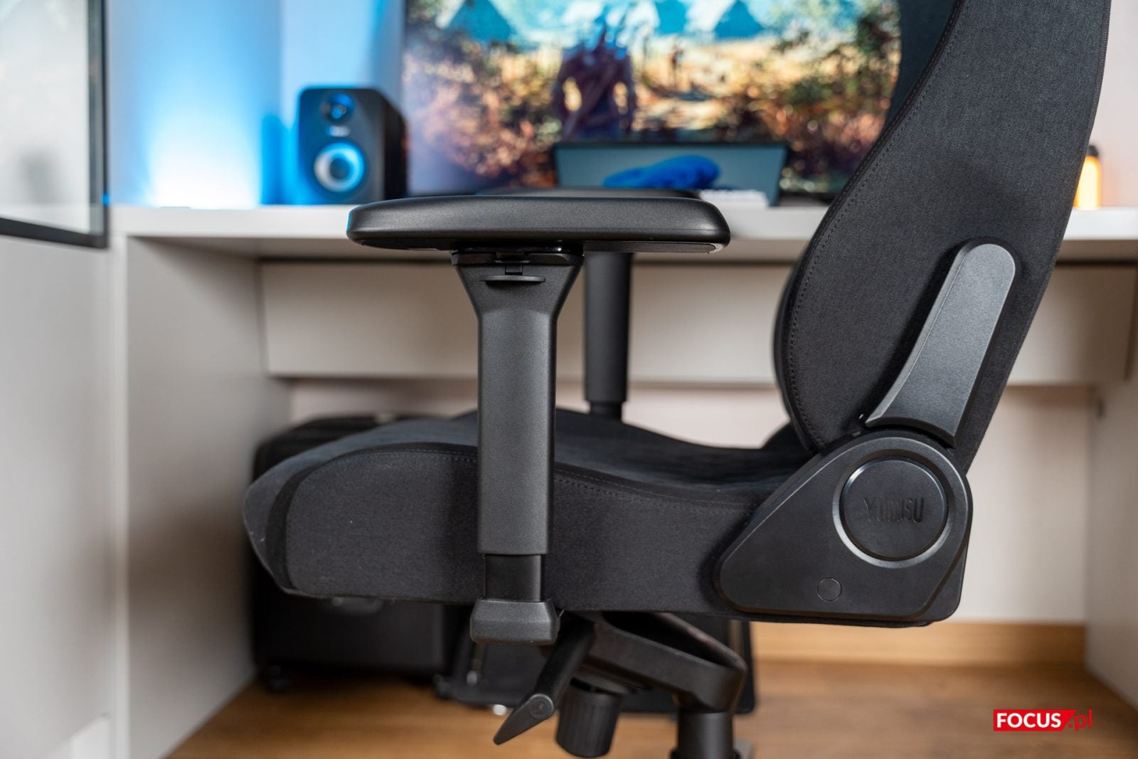 Yumisu 2055 ma wszystkie możliwości regulacji, jakie znamy z foteli gamingowych. Czyli, idąc od dołu, dostajemy regulację wysokości i możliwość wychylenia całej konstrukcji, jak na fotelu bujanym, Stopień sprężystości bujania regulujemy pokrętłem na przodzie podstawy.