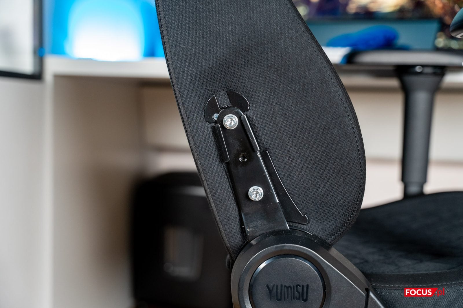 Tym, co wyróżnia Yumisu 2055, jest dodatkowy element umieszczony na oparciu. To coś w rodzaju dodatkowej poduszki umieszczonej na sprężynie i producent nazywa to Harmon Move. Cały element delikatnie porusza się w miarę przemieszczania się pleców i dba o podparcie odcinka lędźwiowego. Mój kręgosłup bardzo nie lubi wszelkiego rodzaju podparć w tym miejscu, pompowanych elementów itp. Zarówno w fotelach biurowych, jak i samochodowych. Tutaj pierwszy raz takie podparcie nie męczy mnie nawet po kilku godzinach przed biurkiem. Jest przymocowane na stałe i nie możliwości żadnej dodatkowej regulacji.