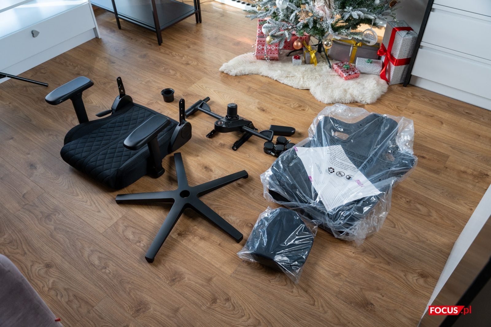 Zestaw jest… typowy i składa się z kółek, podstawy, ramienia, elementu centralnego ze wszystkimi wajchami, siedziska z podłokietnikami, oparcia i poduszki pod głowę. Złożenie całości, po skrót zapraszam do wideo na początku tekstu, zajęło mi 20 minut. To zasługa dwóch rzeczy.