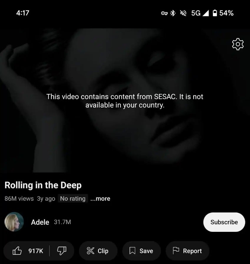 Tymczasem w ostatnich dniach na YouTube Music użytkownicy zaczęli napotykać na utwory oznaczone wykrzyknikiem, których nie można odtworzyć ani wybrać z widoku listy. Pojawia się też pełnoekranowy komunikat o błędzie: „Utwór niedostępny – Ten film zawiera treści z SESAC. Nie jest dostępny w Twoim kraju”. Na YouTubie nie ma co prawda żadnych ostrzeżeń, ale komunikat również się pojawia. Zablokowane utwory mają po kilka milionów wyświetleń i są autorstwa popularnych artystów, takich jak Adele, Nirvany, Green Day, Kanye Westa czy Britney Spears.