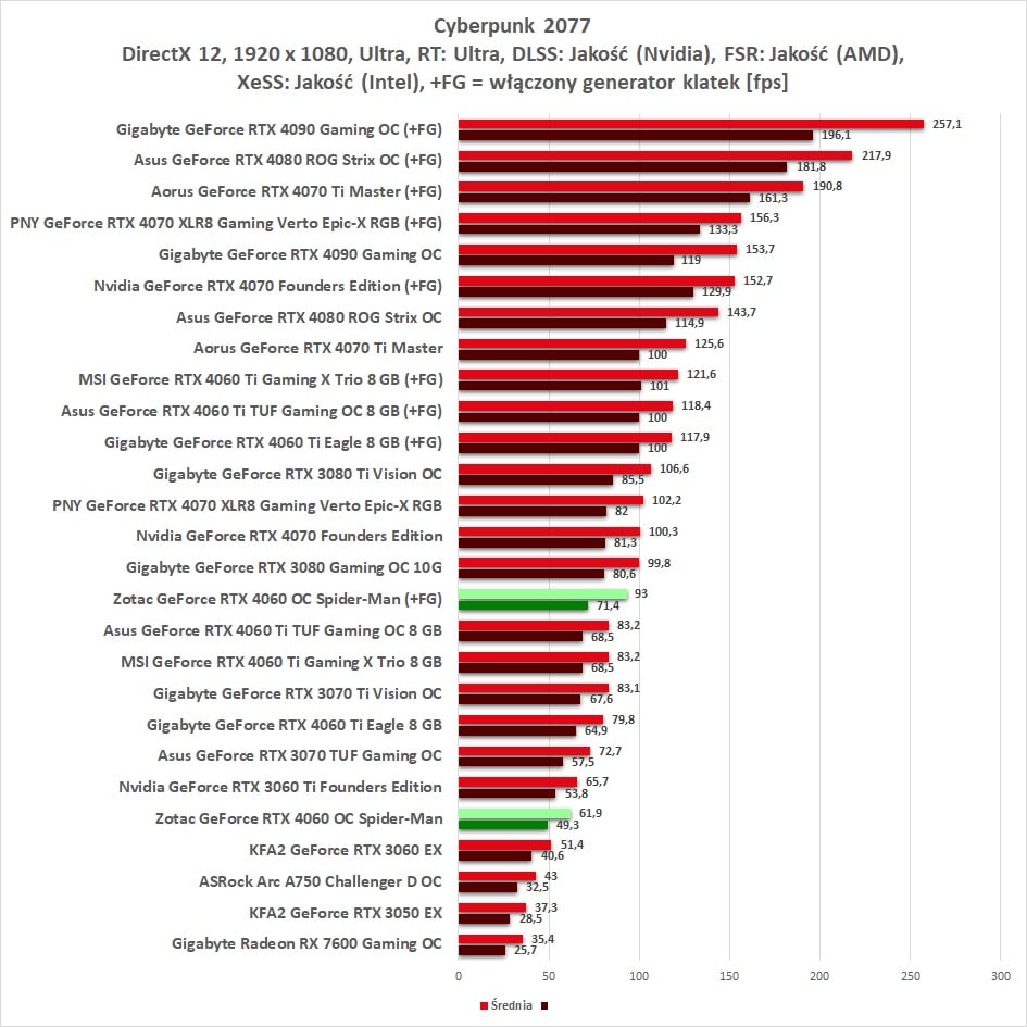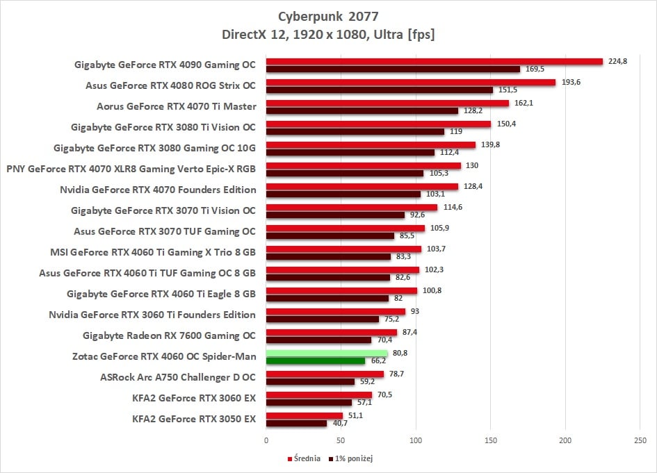 Zotac Gaming GeForce RTX 4060 OC Spider-Man to przedstawiciel serii RTX 4060, która stworzona została do grania w Full HD. Producent zdecydował się nawet na fabryczne podkręcenie karty, co powinno jeszcze podnieść wyniki w grach. Sama wydajność jest bardzo dobra właśnie w 1920 x 1080. W większości gier uda Wam się uzyskać średnio ponad 60 fps przy maksymalnych detalach. W naszych testach, w 1920 x 1080, średnia z 10 gier wyniosła 75,5 fps. Jest to bardzo dobry wynik pokazujący, że spokojnie karta wystarczy do tej rozdzielczości. Warto też zapoznać się z przykładowym wynikiem z gry Cyberpunk 2077 – karta nie ma problemów z zagwarantowaniem płynnej rozgrywki.