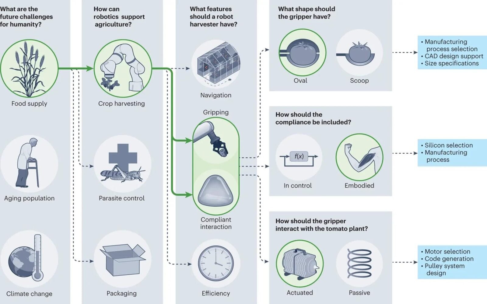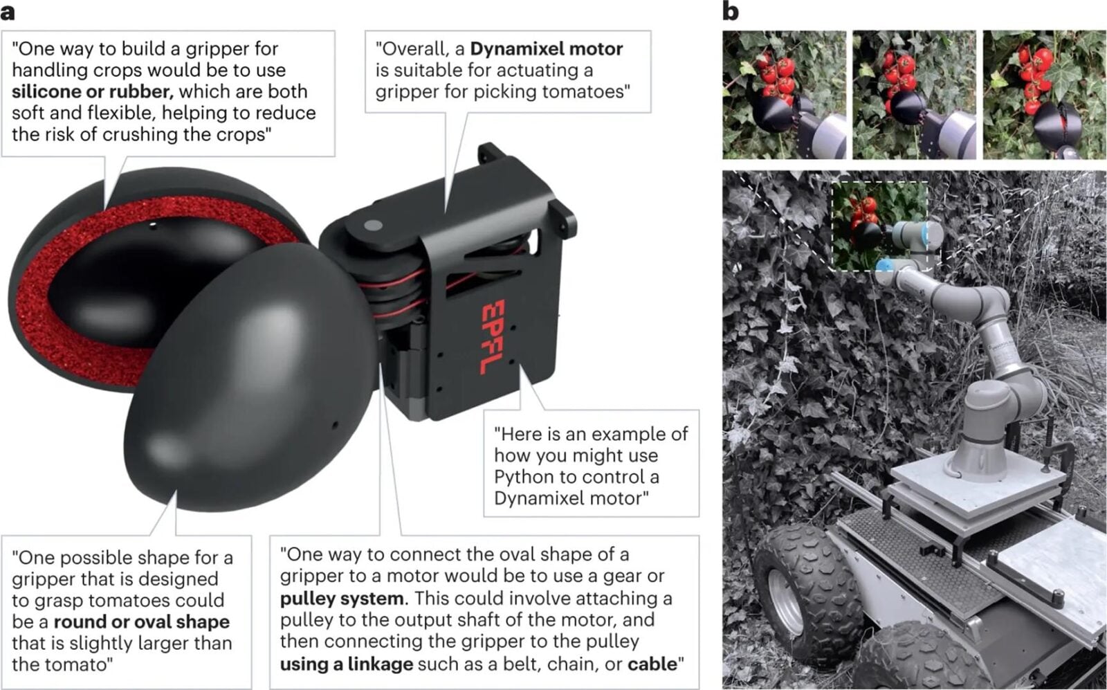 Naukowcy z Delft University of Technology i Swiss Federal Institute of Technology doczekali się publikacji podsumowania swojej pracy w dzienniku Nature Machine Intelligence, w którym to przeczytamy, jak zespół wykorzystał ChataGPT, aby wspomóc się w procesie projektowania i konstruowania robota do zbierania pomidorów. Zdecydowali się na takiego właśnie robota po tym, jak ChatGPT stwierdził, że jedne z wyzwań dla ludzkości obejmują podaż żywności, starzenie się populacji i zmiany klimatyczne. Jako że te dwa ostatnie problemy trudno rozwiązać z wykorzystaniem robota, naukowcy wybrali zaopatrzenie w żywność jako najbardziej obiecujący kierunek ratowania ludzkości i zapytali ChatGPT, jakie cechy powinien mieć właśnie taki robot żniwny.