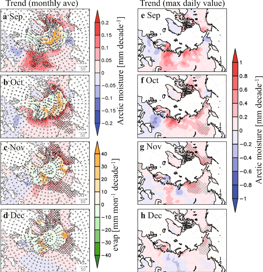 Zasadniczym wnioskiem naukowców jest to, że parowanie wody z Oceanu Arktycznego wzrosło w ciągu ostatnich 40 lat. Najbardziej miało to miejsce nad Morzem Barentsa, Karskim, Czukockim i Wschodniosyberyjskim. To tam pomiędzy październikiem i grudniem wody są nadal stosunkowo ciepłe, a pierwszy lód morski jeszcze się nie pojawia. Wówczas wilgoć z parowania jest transportowana na południe, gdzie bywa uwalniania w postaci opadów. Największych opadów śniegu doświadczała północna Syberia podczas przejść cyklonicznych układów niżowych.