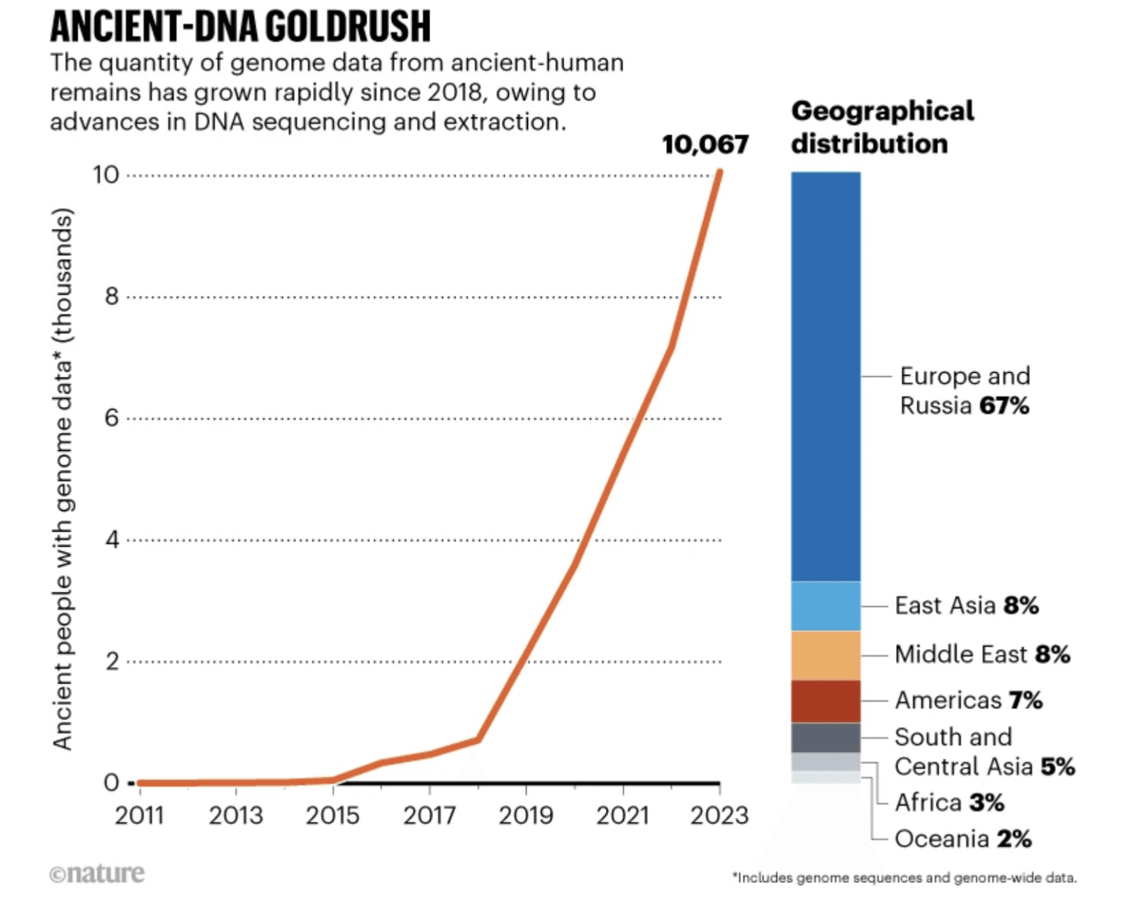 Od 2012 r. większość analizowanych genomów pochodzi z Europy i Rosji, choć od 2015 r. nastąpił niewielki spadek tej proporcji. Dzisiaj coraz częściej szuka się próbek w innych regionach, m.in. Azji Wschodniej, Oceanii i Afryce. Dr Reich był częścią zespołu, który opublikował największe do tej pory badanie starożytnych genomów z Czarnego Lądu.